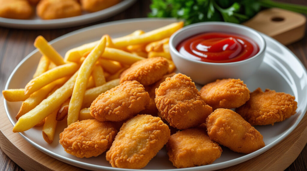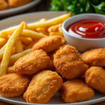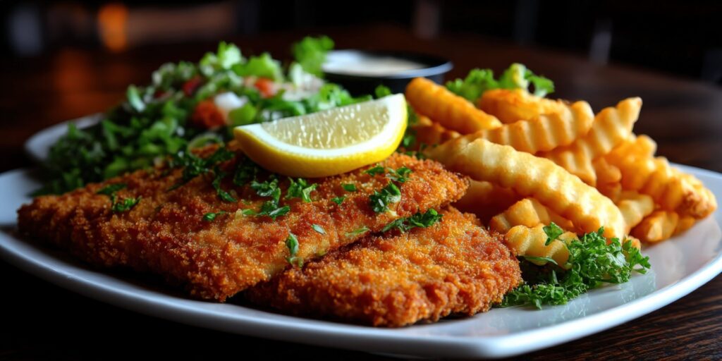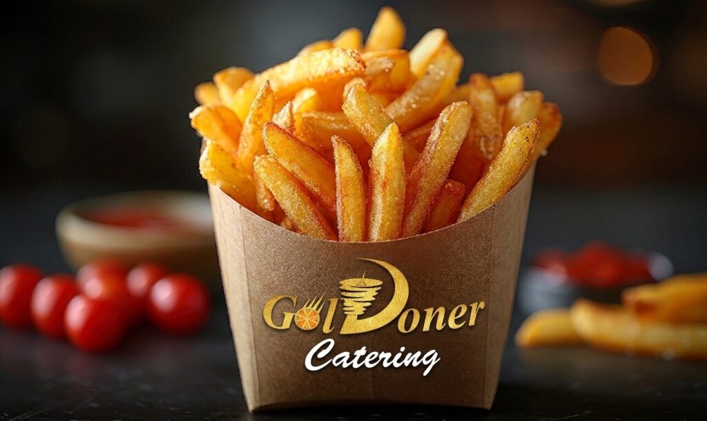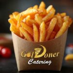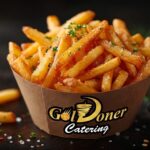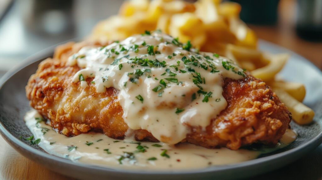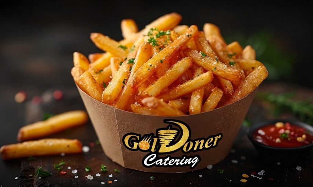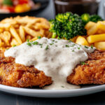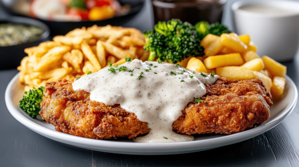 mit Brokkoli, Käse, Sahnesauce und Pommes